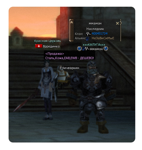| Бегая по просторам Гирана в поисках "еды" своим кошкам, наткнулся на ентого персоонажа... . Это один из "бойцов" вашей армии твинков или у вас появились "тени"? P.S. Разглядывая получившийся снимок, заметил, что в кадр, попал известный многим Е. Чичваркин... . Неужели денег вырученных с продажы "Евросети", нехватило... . Гг.. .